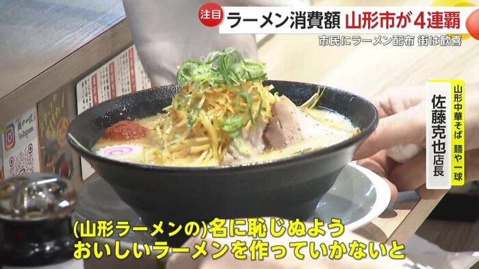 ラーメンとギョーザの消費額トップはどの街か、総務省家計調査で、2025年のラーメン消費額が1世帯2万5102円となった山形市が4年連続の全国1位を獲得した。市役所では市民と飲食店関係者が快挙を祝い、ラーメンの無料配布も行われた。
