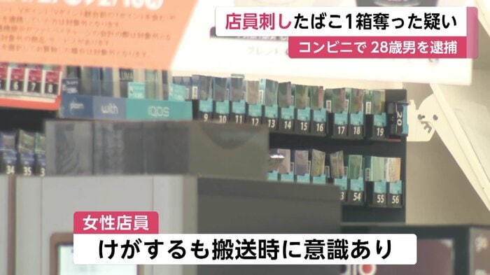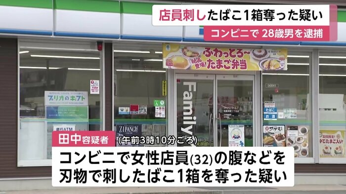 逮捕されたのは鈴鹿市の無職・田中蒼馬容疑者(28)で、7日午前3時10分ごろ、三重・鈴鹿市のコンビニで女性店員(32)の腹などを刃物で刺し、たばこ1箱を奪った疑いが持たれている。