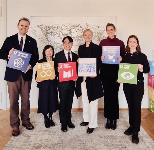 当日は、国連の前事務総長である潘基文氏がオーストリアの前大統領であるハインツ・フィッシャー氏とSDGsを推進するために共同設立した潘基文財団(Ban Ki-moon Foundation)を訪問し、CEOのモニカ・フローラ氏と面会しました。財団では、SDGsを達成するためのユースに向けたリーダーシップ教育や、社会のリーダーに対する意思決定力の醸成を目的とした研修を進めており、2030年に向けてさまざまな仕掛け作りにも努めているとの説明がありました。