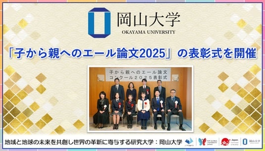国立大学法人岡山大学(本部:岡山市北区、学長:那須保友)と岡山経済同友会、岡山県で組織するダイバーシティ推進実行委員会おかやま(会長:寺澤孝文・学術研究院教育学域教授)が募集した「子から親へのエール論文2025」の受賞者が決定し、2026年1月26日に岡山県庁にて表彰式・懇談会が開催されました。