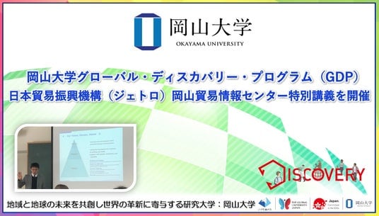 国立大学法人岡山大学(本部:岡山市北区、学長:那須保友)のグローバル・ディスカバリー・プログラム(GDP)では2026年1月13日、日本貿易振興機構(ジェトロ)岡山貿易情報センターより若林利昭所長および川本暖乃係長を迎え、後期開講科目「Trade Policy and Development」にて特別講義を開催しました。