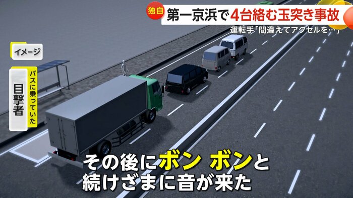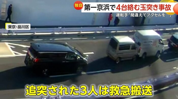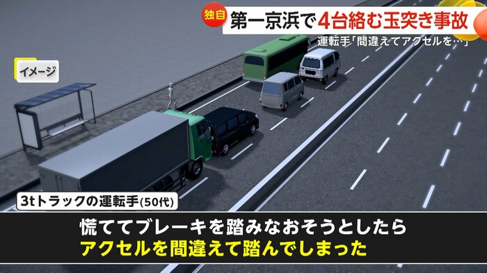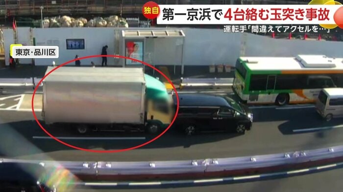 通勤時間帯の第一京浜で、トラックが前方の車に追突し、合わせて4台が絡む玉突き事故が起きた。運転手は、信号が青に変わった際に「ブレーキを緩めたが前の車が発進せず、慌ててブレーキとアクセルを踏み間違えた」と話している。