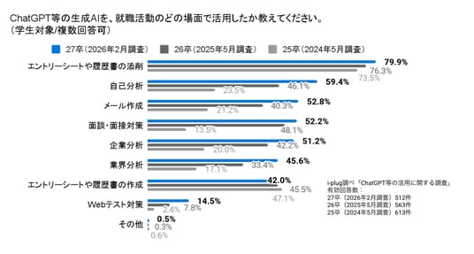 ChatGPT等の生成AIの活用場面に関する設問において、「就職活動」での利用が最多の75.8%でした。2024年(25卒)調査時の45.8%、2025年(26卒)調査時の63.0%と比較すると、この2年間で30ポイント増加。就活においてもChatGPT等の生成AIの活用はさらなる広がりがみうけられます。