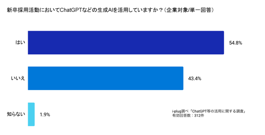企業側の新卒採用活動におけるChatGPT等の生成AIの活用状況について、「活用している」と回答した企業は、54.8%でした。