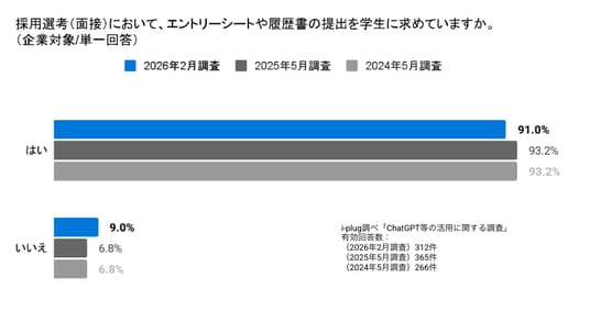採用選考(面接)において、エントリーシートや履歴書の提出を学生に求めている企業は91.0%。昨年5月に実施した同内容の調査結果と比較して、大きな変化はみられませんでした。