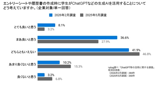 学生がエントリーシートや履歴書作成時に、生成AIを活用することに対して「とても良いと思う」「まあ良いと思う」と回答した企業は44,7%でした。前年調査と比較して肯定する企業が増加傾向にあることがわかります。 しかし、企業側の最多回答は「どちらともいえない(41.9%)」であることから、ChatGPT等の生成AIの活用に対して一定の理解を示しつつも、明確に判断を示していない企業が多いと推察されます。