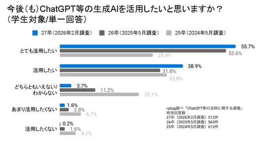 一方で、「活用したくない」または「あまり活用したくない」を選択した27卒学生はわずか1.8%。ChatGPT等の生成AIが、今後の大学生活や就職活動において必要不可欠なサービスになることが推測できます。