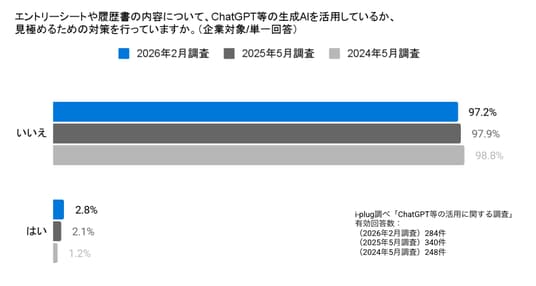 企業に対し、選考書類においてChatGPT等のAI使用を見極める対策を行っているか尋ねたところ、97.2%が「いいえ」と回答しました。 前年調査の97.9%と比較しても大きな変化はなく、学生のAI利用率が急増する一方で、企業側が選考プロセスにおいてAI検知等の具体的な対策や規制を強化する動きは見られません。