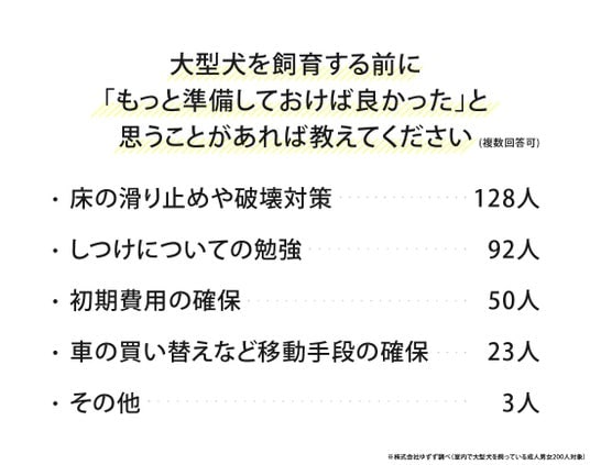 「大型犬を飼育する前に、もっと準備しておけば良かったと思うこと(複数回答可)」では、「床の滑り止めや破壊対策」128人が最多となりました。