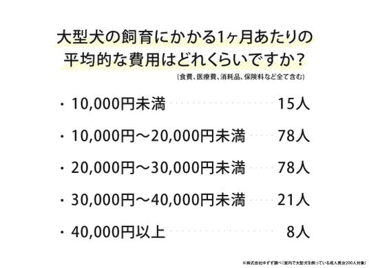 「大型犬の飼育にかかる1ヶ月あたりの平均的な費用(食費、医療費、消耗品、保険料など全て含む)」を尋ねたところ、「10,000円~20,000円未満」78人と「20,000円~30,000円未満」78人が同率で最多となりました。