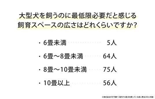 「大型犬を飼うのに最低限必要だと感じる飼育スペース」については、「8畳~10畳未満」75人が最多となりました。