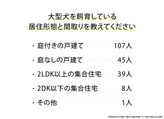 本調査では、室内で大型犬と暮らす飼い主の実態として、- 居住形態は「庭付きの戸建て」が最多(107人)