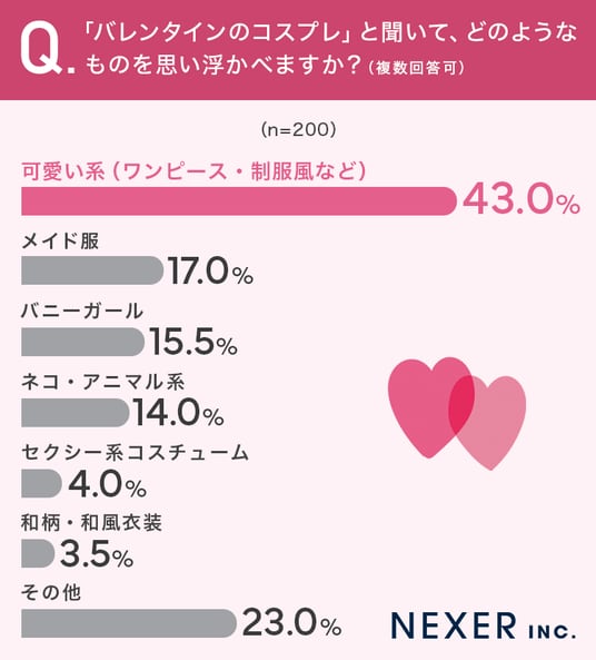 やはり、バレンタインという甘いイベントにふさわしい「可愛い系」の衣装が真っ先に思い浮かぶ方が多いようです。