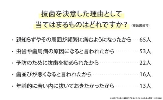 親知らずを抜いたことがある122人に「抜歯を決意した理由として当てはまるものはどれですか?」と尋ねたところ、最も多かったのは「親知らずやその周囲が頻繁に痛むようになったから」(65人)でした。