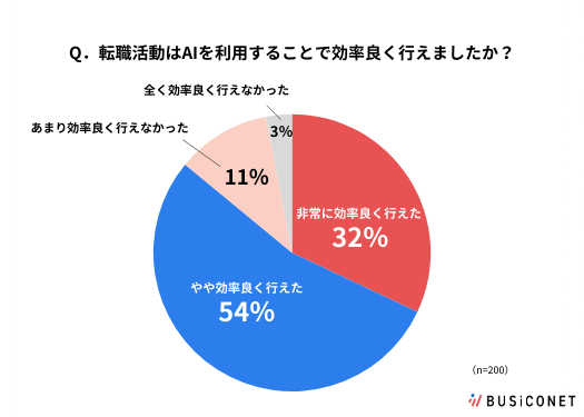 「Q.転職活動はAIを利用することで効率良く行えましたか?」という問いに対して、「非常に効率良く行えた」が32%、「やや効率良く行えた」が54%、「あまり効率良く行えなかった」が11%、「全く効率良く行えなかった」が3%という調査結果が出ました。