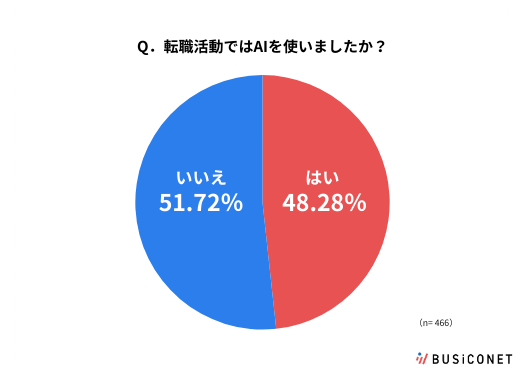 過去2年以内に転職活動を行った466名を対象としたスクリーニング調査では、「Q.転職活動ではAIを使いましたか?」という問いに対して、「はい」と答えた人は48.28%にも上りました。