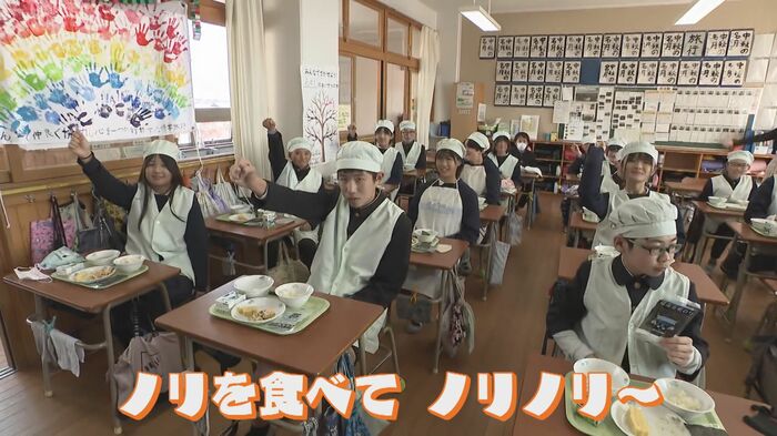今季、獲れたばかりのノリを味わった小学6年生。「おいしい。パリパリ」「最高にうまいです。無限に食べられる」「ノリを食べて、ノリノリ~」とみんな笑顔だった。