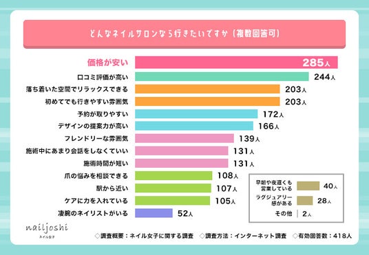ネイルサロン選びで重視する条件、第1位は『価格が安い』