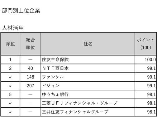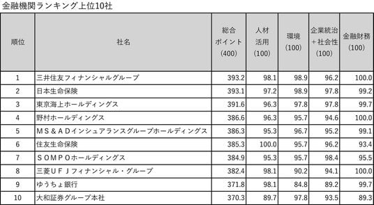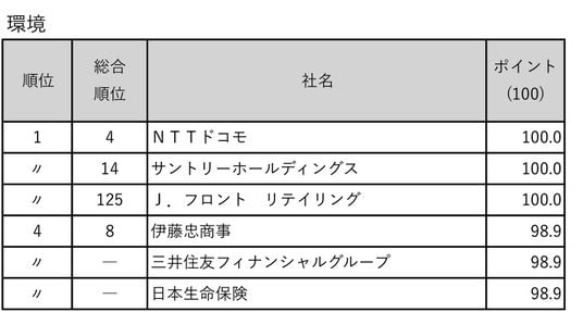 金融機関ランキングは三井住友フィナンシャルグループが4年連続の1位となりました。部門別でも人材活用5位、環境4位、企業統治+社会性24位と高水準です。同社は従業員エンゲージメント調査を毎月実施し、結果を部署単位で迅速に還元しています。1人当たりの年間教育研修費用・時間もそれぞれ10万円、25.5時間とトップクラスです。環境面では、脱炭素に取り組むための「トランジションファイナンス」に関するエンゲージメントを積極的に実施しています。