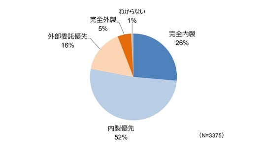 国内企業のアプリケーション開発を担当もしくはマネジメントする方を対象に、アプリケーション開発の基本方針を確認したところ、外製指向(「外部委託優先」と「完全外製」の和)の企業は21%であったのに対し、内製指向(「完全内製」と「内製優先」の和)は78%に上り、企業の内製化意欲が非常に高いことがわかった。これは、企業が外部委託に限界を感じ、内部での開発力を育成し始めていることを顕著に示している。