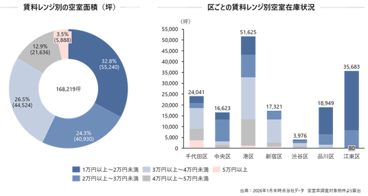 主要7区全体の空室面積の合計約16.8万坪のうち坪1万円台での募集が33%で最多、次いで坪3万円台での募集が続く。最多の空室を抱える港区(約5.1万坪)が中高価格帯中心であるのに対し、2位の江東区の空室は低価格帯が大半で、エリアによって空室量だけでなく価格帯にも顕著な差が見られる。