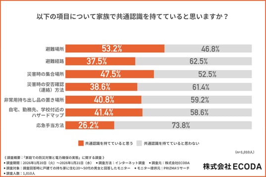 また、家族間で「避難場所」や「災害時の集合場所」の共有はある程度進んでいるものの、「避難経路」「災害時の安否確認(連絡)方法」「応急手当方法」などの共通認識を持てている家庭は少ないことがわかりました。