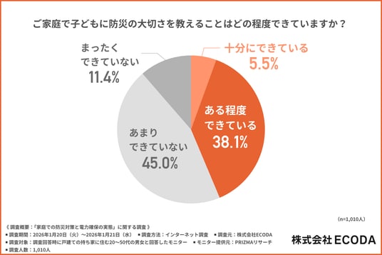 「家庭で子どもに防災の大切さを教えることはどの程度できているか」と尋ねたところ、約4割が『十分にできている(5.5%)』『ある程度できている(38.1%)』と回答しました。
