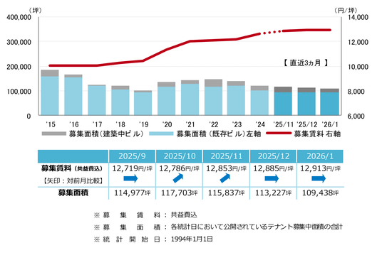募集賃料 5ヵ月連続の上昇 13,000円/坪台が目前に迫る