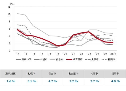 三幸エステート株式会社(本社:東京都中央区、取締役社長:福島正二郎)は、2026年1月度の名古屋市オフィス賃貸状況(空室率&現空面積:全規模、募集賃料&募集面積:全規模、規模別空室率、主要エリア※1空室率:全規模)および全国6大都市(東京・札幌・仙台・名古屋・大阪・福岡)の大規模ビルのマーケットデータをまとめた「オフィスマーケット2026年2月号名古屋」を公表します。