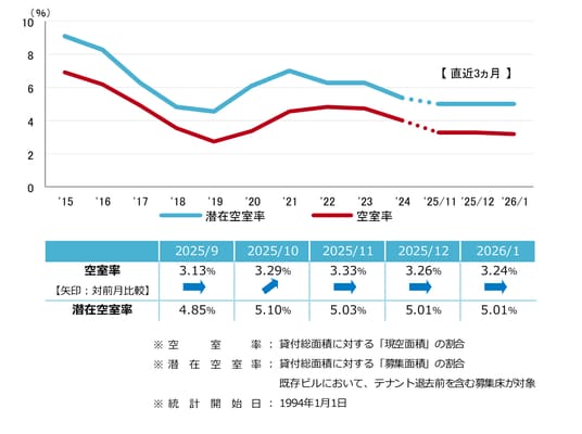 空室率は前月比マイナス0.02ポイントの3.24%となり、前月からほぼ横ばいだった。集約や立地改善目的の移転により空室消化が進んだ一方、新築ビル等で現空床が生じ、わずかな動きに止まっている。潜在空室率は前月から横ばいの5.01%だった。