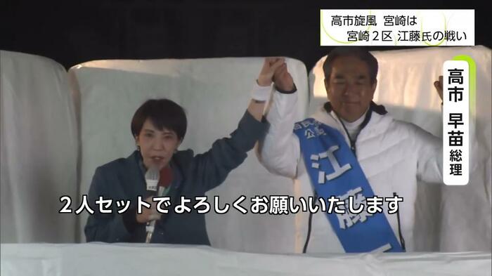 8日投開票が行われた衆議院選挙は自民党が圧倒的な勝利をおさめた。原動力となったのは「高市旋風」に他ならない。宮崎2区では前職の江藤拓氏が、自らの「コメ発言」によって大逆風の選挙戦となる中、選挙戦終盤に高市総理が応援に駆け付けた。江藤氏は小選挙区で敗れたものの、比例での復活当選を果たした。江藤氏にとってどんな選挙戦だったのか。宮崎2区の選挙戦を振り返る。