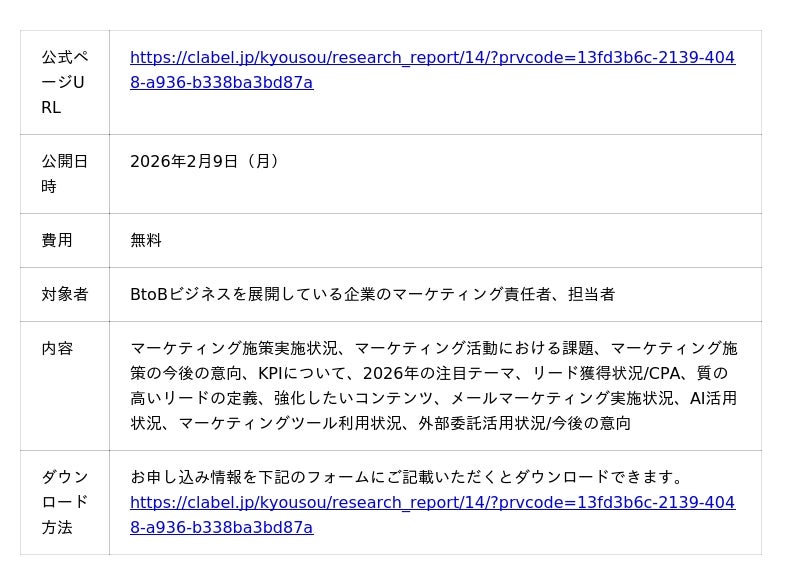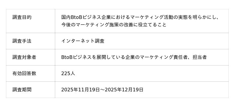 BtoBマーケティング支援事業を行う株式会社シーラベル(本社:神奈川県横浜市、代表取締役:渡辺 敬吾)は、BtoBマーケティング関連企業16社と共同で、BtoBビジネスを展開している企業のマーケティング責任者・担当者225名を対象に「BtoBマーケティング実態調査2026」を実施いたしました。この調査では、マーケティング活動における課題、マーケティング施策の今後の意向、2026年の注目テーマなどを明らかにしました。
