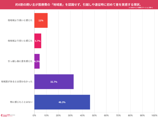 ペット医療費の地域差については、「特に感じたことはない(約46.3%)」「地域差があるとは思わなかった(約32.7%)」を合わせ、約8割(79.0%)が意識していない結果となりました。