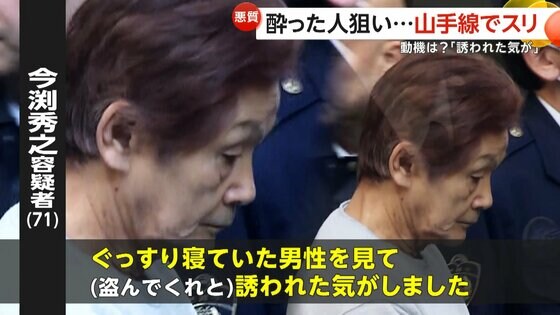 「盗んでくれと誘われた気が…」酔っている人を狙いJR山手線で… ギャラリー 1/11 記事に戻る 2/11 記事に戻る 3/11 記事に戻る 4/11 記事に戻る 5/11 記事に戻る 電車内でスリをした現行犯で逮捕された今渕秀之容疑者(71) 6/11 記事に戻る 事件は7日、JR池袋駅の山手線で発生した(東京・豊島区)(資料) 7/11 記事に戻る 今渕容疑者ら2人は終電間際の山手線に現れた(イメージ) 8/11 記事に戻る 2人は酒に酔って寝ていた男性に狙いを定めた(イメージ) 9/11 記事に戻る 男性の横に座り、もう1人が犯行を隠すように前に立ちバッグを物色した(イメージ) 10/11 記事に戻る 11枚目以降の画像を見る 1 2