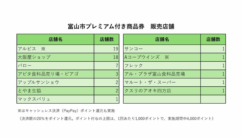 富山市が20%お得な「プレミアム付き商品券」販売へ 1万円で1… ギャラリー 1/6 記事に戻る 2/6 記事に戻る 3/6 記事に戻る イメージ 熊本市のプレミアム付き商品券 4/6 記事に戻る イメージ 5/6 記事に戻る 6/6 記事に戻る