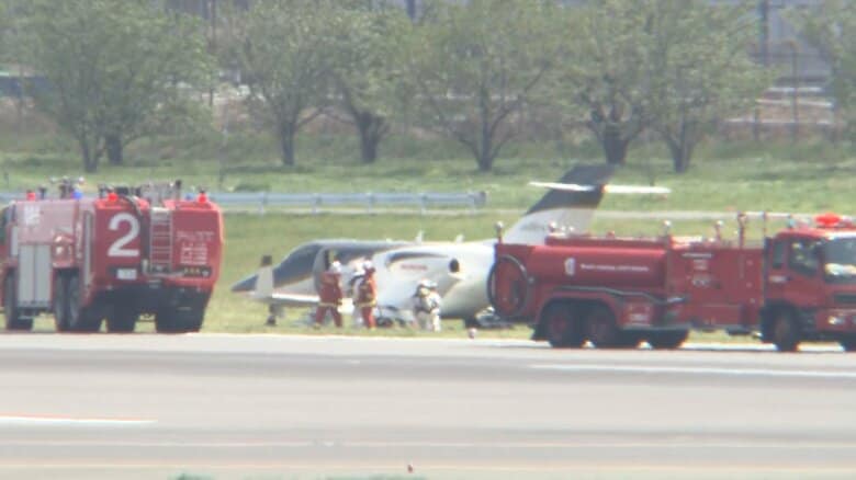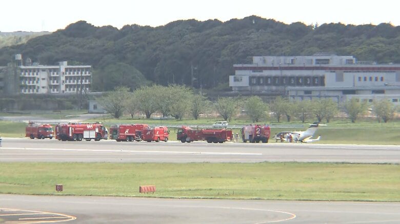 プライベートジェット機が風にあおられ成田空港の滑走路外で停…
