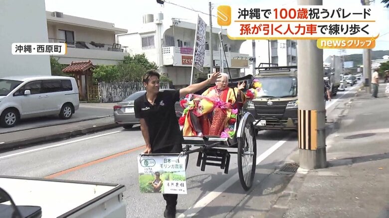 孫が引く人力車で「100歳記念パレード」孫18人、ひ孫22人、玄… ギャラリー 1/11 記事に戻る 人力車に乗る與那嶺芳子さん 2/11 記事に戻る 人力車を引いていた芳子さんの孫の與那嶺亮太さん 3/11 記事に戻る うれしそうに孫の亮太さんと会話する芳子さん 4/11 記事に戻る 5/11 記事に戻る 6/11 記事に戻る 3月20日に100歳を迎えた、與那嶺芳子さん 7/11 記事に戻る 人力車に乗って地域を巡る“100歳記念パレード” 8/11 記事に戻る 孫18人、ひ孫22人、玄孫2人に恵まれた芳子さん 9/11 記事に戻る 地域の人たちも駆けつけ、盛大なお祝いになったパレード 10/11 記事に戻る 11枚目以降の画像を見る 1 2