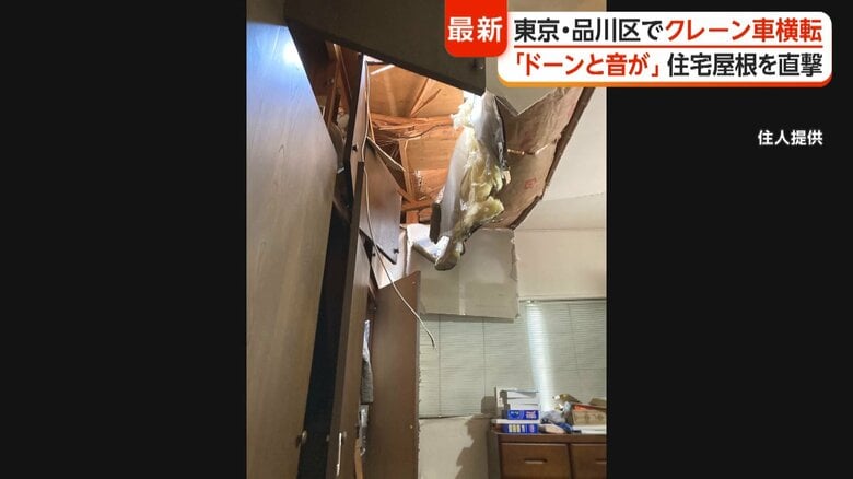 住宅街で工事中のクレーン車が横転、アームが隣家の屋根の室内…