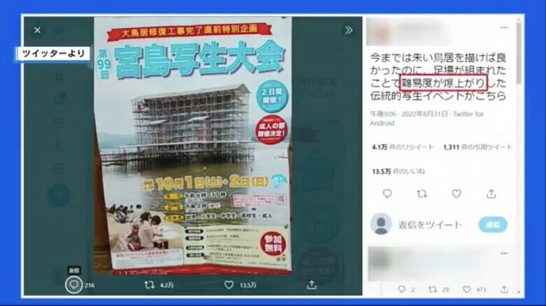 芸大の入試レベル?「宮島・大鳥居の写生大会」の“難易度”爆… ギャラリー 1/10 記事に戻る 小刻みにペンを動かし、複雑な大鳥居をデッサンする男性 2/10 記事に戻る 3/10 記事に戻る 10月1日・2日に開かれた「宮島写生大会」に参加する人たち 4/10 記事に戻る 5/10 記事に戻る 6/10 記事に戻る 7/10 記事に戻る 8/10 記事に戻る 鹿に画用紙をかじられるトラブルも… 9/10 記事に戻る 10/10 記事に戻る