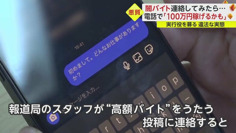 【闇バイトに連絡したら】“詐欺だが捕まらない方法でやってる… ギャラリー 1/10 記事に戻る 2/10 記事に戻る 3/10 記事に戻る “高額バイト”で検索すると5000件以上がヒット。「ブラック案件」と明言するアカウントに連絡してみる 4/10 記事に戻る メールを送ると早速返信が 5/10 記事に戻る 特殊詐欺の受け子を告げられたスタッフ。「ATMでお金をもらうということ?」と聞くと、違法行為と明言 6/10 記事に戻る 「捕まらない方法でやっている」という男。カメラがあっても「マスクをしていれば問題ない」とキッパリ 7/10 記事に戻る 2週間で50~60万円は余裕、と話す男 8/10 記事に戻る スタッフが身分を明かすと男の態度が一変。「許可ないと放送にのせたらあかんやろ」という男に告げる 9/10 記事に戻る 激しい口調でスタッフを脅す男 10/10 記事に戻る