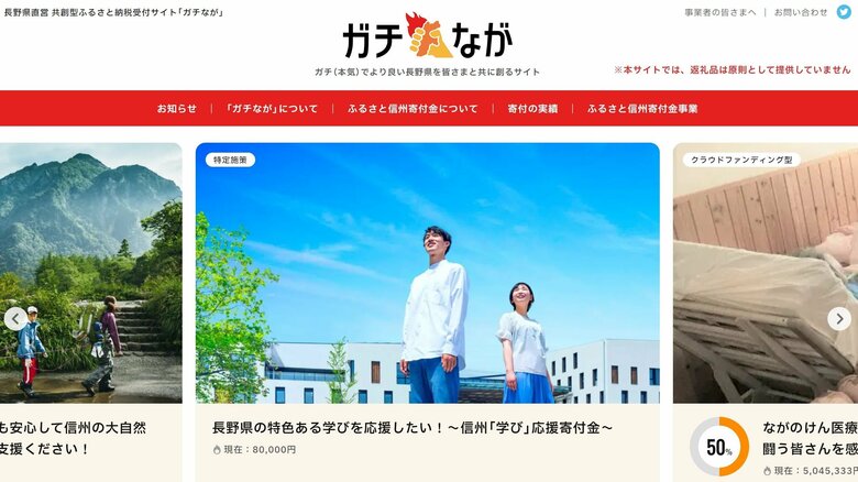 返礼品を“あえてなくした”ふるさと納税サイトを長野県が開設… ギャラリー 1/8 記事に戻る 長野県が4月3日に開設した「ガチなが」 2/8 記事に戻る 掲載されている事業の一例 3/8 記事に戻る ガチの寄付を呼び掛けているという 4/8 記事に戻る 長野県に寄せられたふるさと納税の寄付額の推移 5/8 記事に戻る 民間のポータルサイトを利用しないと寄付が集まらないという現状がある(画像はイメージ) 6/8 記事に戻る 「ガチなが」の特徴と狙い 7/8 記事に戻る プロジェクトページには寄付金の用途も明記している 8/8 記事に戻る