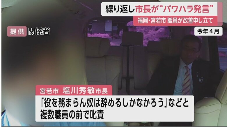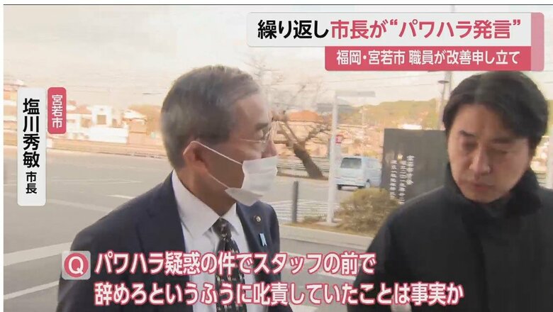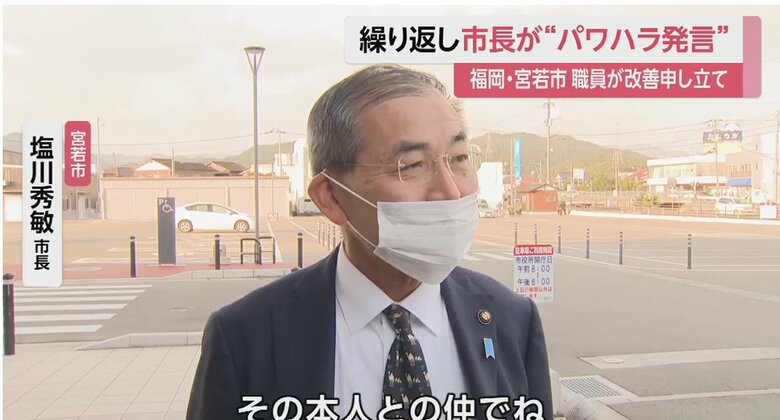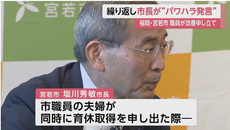 福岡・宮若市長「辞めろ」「すみませんで済むか」パワハラ発言… ギャラリー 1/12 記事に戻る 関係者からの提供映像より 2/12 記事に戻る 市職員の夫婦が同時に育休取得を申し出た際、発したとされる市長の発言内容 3/12 記事に戻る 4/12 記事に戻る スタッフの前で「やめろ」と叱責していた?と記者に問われた際の塩川市長 5/12 記事に戻る 6/12 記事に戻る 7/12 記事に戻る 8/12 記事に戻る 9/12 記事に戻る 10/12 記事に戻る 11枚目以降の画像を見る 1 2