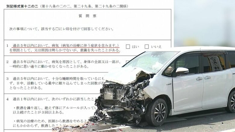 ウソが起こした死亡事故!? 持病を隠して免許更新か…4日後に… ギャラリー 1/9 記事に戻る 乗用車(右)が追突し軽自動車は大破(2023年7月・浜松市) 2/9 記事に戻る 追突された軽自動車の男性は死亡 3/9 記事に戻る 追突した乗用車 4/9 記事に戻る 免許更新時の質問票(静岡県警HP) 5/9 記事に戻る 逮捕された男の乗用車 6/9 記事に戻る 7/9 記事に戻る 免許更新時の質問票(静岡県警HP) 8/9 記事に戻る 3台玉突き事故の現場 9/9 記事に戻る