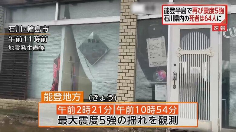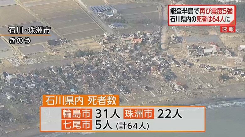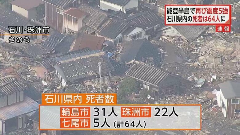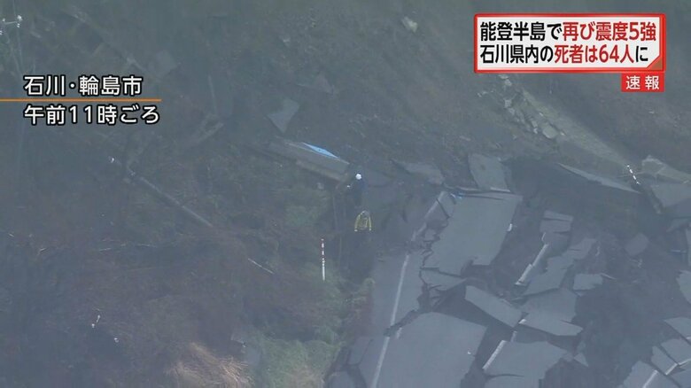 【能登半島地震】3日も震度5強の揺れ 石川県内の死者は64人に… ギャラリー 1/14 記事に戻る 石川県内で64人の死亡が確認された 2/14 記事に戻る 輪島市では「SOS」の文字も確認できた 3/14 記事に戻る 気象庁が土砂災害への警戒呼びかけ 4/14 記事に戻る 5/14 記事に戻る 6/14 記事に戻る 7/14 記事に戻る 8/14 記事に戻る 9/14 記事に戻る 10/14 記事に戻る 11枚目以降の画像を見る 1 2