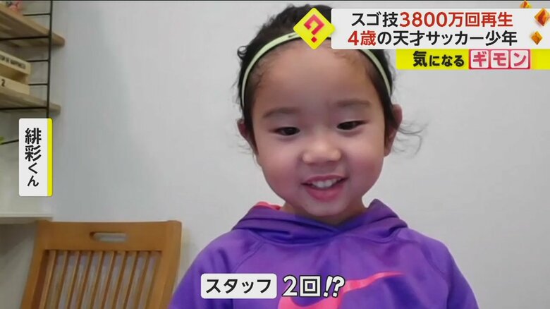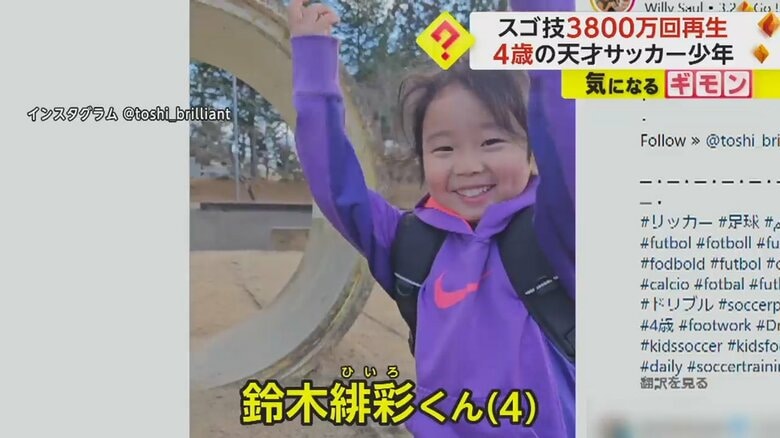 4歳のスゴ技“3800万回再生” 土管で“股抜き”ボールを背中… ギャラリー 1/18 記事に戻る 2/18 記事に戻る 3/18 記事に戻る 4/18 記事に戻る 華麗なドリブルを披露した鈴木緋彩(4)くん 5/18 記事に戻る 3800万回以上再生されている動画 6/18 記事に戻る 今回のチャレンジについて答える緋彩くん 7/18 記事に戻る 緋彩くんがサッカーの練習をする様子 8/18 記事に戻る 「普段はちょっとしたことで泣く」と父・俊洋さんが話す緋彩くんの様子 9/18 記事に戻る 好きな選手について「クリロナとメッシ」と答える緋彩くん 10/18 記事に戻る 11枚目以降の画像を見る 1 2