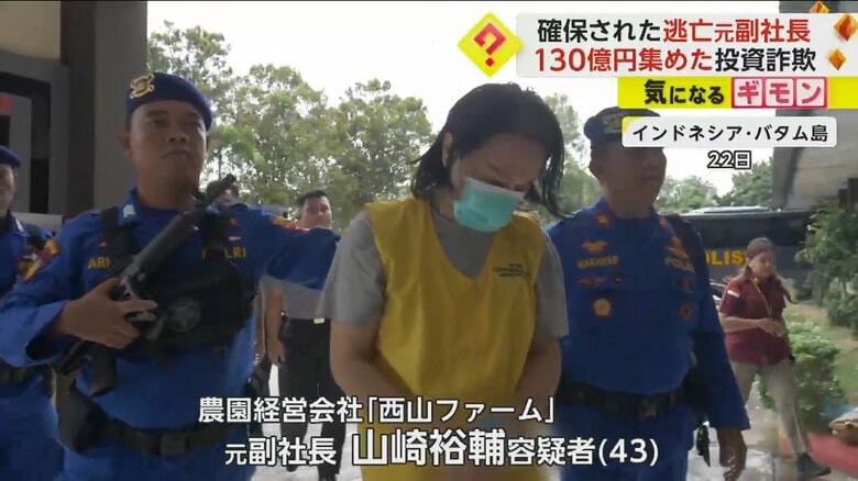 “130億円”を集めた投資詐欺 国際指名手配中の元農園経営会… ギャラリー 1/11 記事に戻る 2/11 記事に戻る 3/11 記事に戻る 4/11 記事に戻る 山崎容疑者が取材に応じているようす 5/11 記事に戻る 5年前との変化。髪が肩まで伸び、目はうつろ。ほおはこけているように見える 6/11 記事に戻る インドネシアの海の上。サングラスに帽子姿でボートに乗る山崎容疑者 7/11 記事に戻る インドネシア当局が不法労働者の密航を取り締まっている 8/11 記事に戻る 海外を転々と逃げ回っていた山崎容疑者 9/11 記事に戻る 記者からの質問に回答する山崎容疑者 10/11 記事に戻る 11枚目以降の画像を見る 1 2