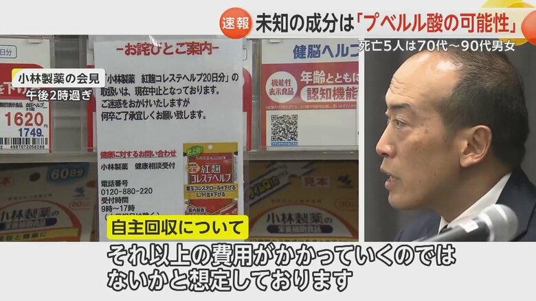 未知の成分は「“プベルル酸”の可能性」小林製薬が厚労省に報… ギャラリー 1/10 記事に戻る “未知の成分”は「プベルル酸の可能性」 2/10 記事に戻る 3/10 記事に戻る 名古屋大学・柴田玲特任教授 4/10 記事に戻る 5/10 記事に戻る 6/10 記事に戻る FNNの集計では自主回収を行っている会社は66社(3月29日現在) 7/10 記事に戻る 8/10 記事に戻る 9/10 記事に戻る 10/10 記事に戻る