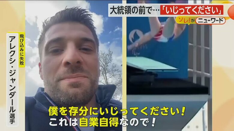 「いじってください」大統領の目前で大失敗 飛び込みの代表選… ギャラリー 1/11 記事に戻る バランスを崩し落下した選手 2/11 記事に戻る 3/11 記事に戻る 式典が行われたフランス・パリ郊外に完成したオリンピック会場 4/11 記事に戻る オリンピック会場完成式典で、3人の飛び込みの代表選手がパフォーマンスを披露 5/11 記事に戻る フランス・パリ郊外のオリンピック会場完成式典に参加するマクロン大統領 6/11 記事に戻る 3人の選手が飛び込む中、バランスを崩した1番右の選手 7/11 記事に戻る バランスを崩し、プールへまっさかさまになった選手 8/11 記事に戻る 大事な式典での失敗にコメントをするアレクシ・ジャンダール選手 9/11 記事に戻る 「僕を存分にいじってください」語るアレクシ・ジャンダール選手 10/11 記事に戻る 11枚目以降の画像を見る 1 2