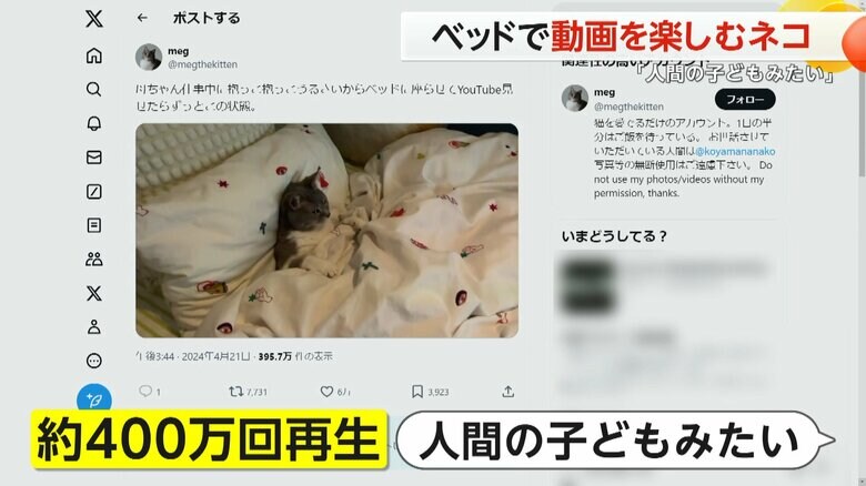 【約400万回再生】枕を背もたれに布団をかぶり、ネズミの動画… ギャラリー 1/12 記事に戻る 2/12 記事に戻る メグちゃん(13)の視線の先にあったのは…ネズミが走り回る動画 3/12 記事に戻る 4/12 記事に戻る (提供:meg(@megthekitten)) 5/12 記事に戻る 都内で目撃されたベッドに座り動画サイトに釘付けのネコ 6/12 記事に戻る 今SNSで話題となっている13歳のメグちゃん 7/12 記事に戻る 枕を背もたれにして布団をかぶり、真剣なまなざしで何かを見つめているメグちゃん 8/12 記事に戻る メグちゃんの視線の先にあったネズミが走り回る動画 9/12 記事に戻る 400万回近く再生され「人間の子どもみたい」と話題となっているSNSの映像 10/12 記事に戻る 11枚目以降の画像を見る 1 2