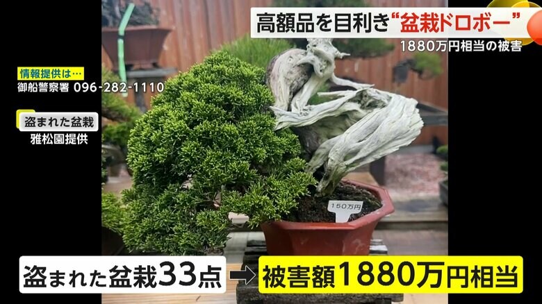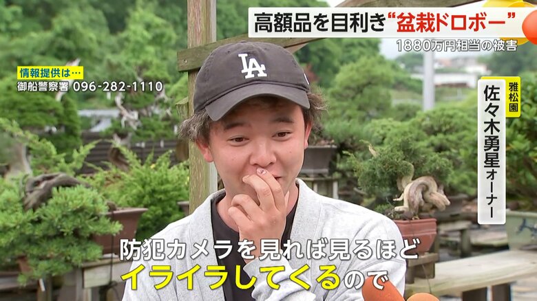 高額品を目利き“盆栽ドロボー” 33点1880万円相当の被害に…… ギャラリー 1/12 記事に戻る 2/12 記事に戻る (雅松園提供) 3/12 記事に戻る (雅松園提供) 4/12 記事に戻る 5/12 記事に戻る 腰をかがめて、忍び足で盆栽に近づく盆栽ドロボー 6/12 記事に戻る ずらりと並べられた盆栽をじっくりと品定めする盆栽ドロボー 7/12 記事に戻る 窃盗事件が発生した熊本・御船町の盆栽専門店「雅松園」 8/12 記事に戻る 犯人に対する憤りについて話す雅松園・佐々木勇星オーナー 9/12 記事に戻る 「高額なモノからピンポイントで盗んでいる」と見られる盆栽ドロボー 10/12 記事に戻る 11枚目以降の画像を見る 1 2